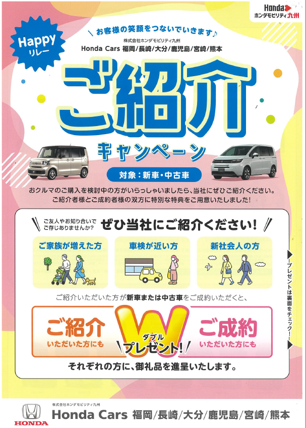 今回は、ご親戚・ご友人等々ご紹介いただいた方が、新車または中古車をご成約いただきますと、ご紹介いただいた方・ご成約いただいた方にもそれぞれの方々にプレゼントをご用意しております♪