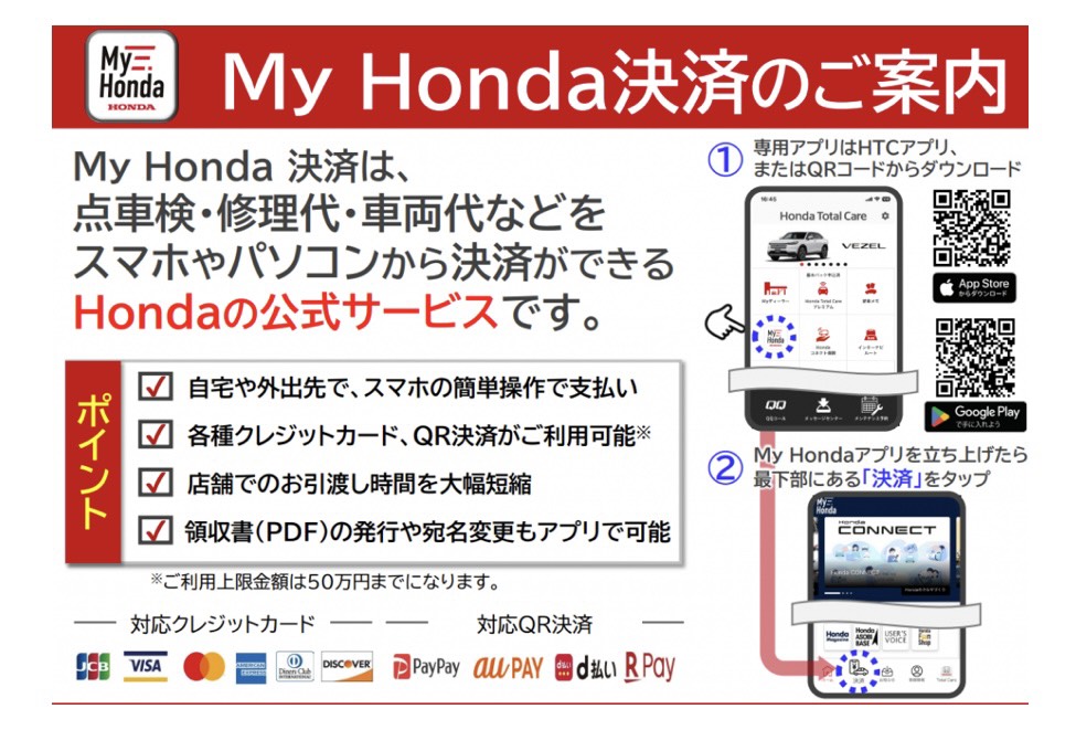 点検代・修理代・車両代などをスマホやパソコンから決済できるHondaの公式サービスです!