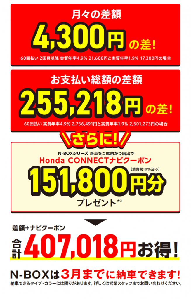 早速ですが、N-BOXの残クレ・バリ保 低金利キャンペーンが今月の2/28までになっております。