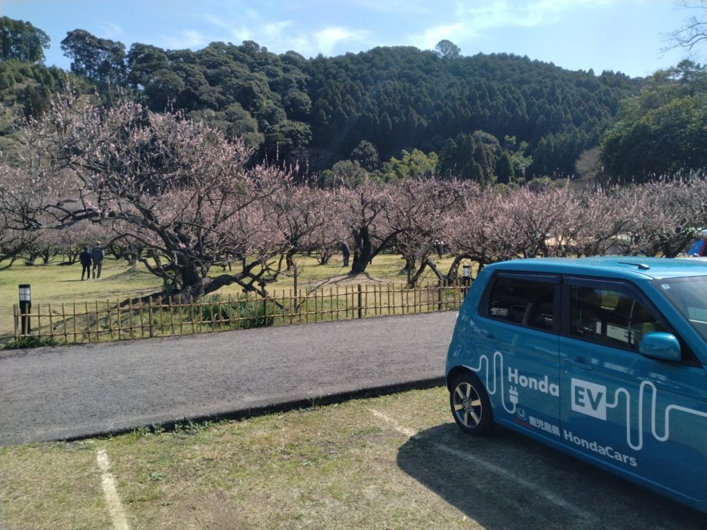 駐車場からのN-ONE e:と梅園です。