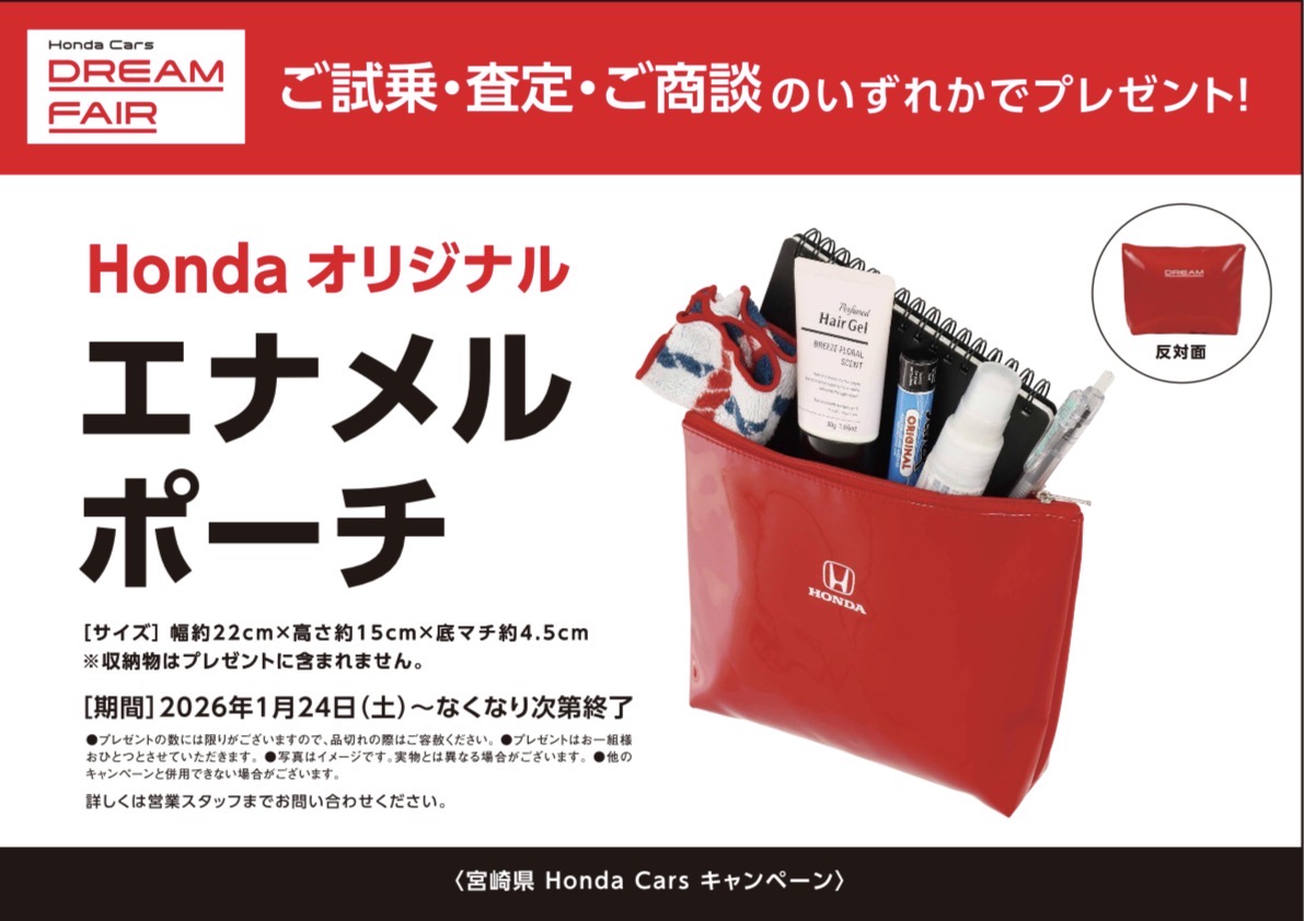 また、期間中に試乗・商談・査定をしていただいた方に「Hondaオリジナル エナメルポーチ」をプレゼントいたします!