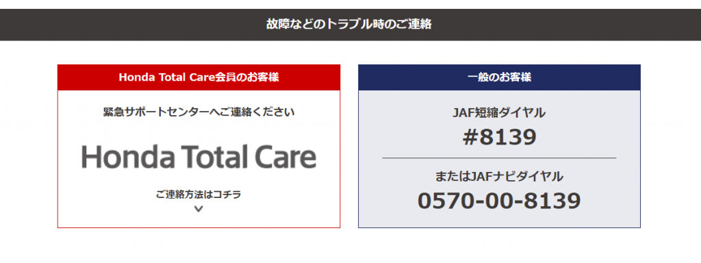 期間中のお車のトラブルは、JAFまたはホンダトータルケアまでご連絡をお願い致します。