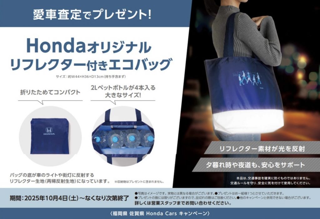 10/4(土)から愛車査定でHondaオリジナルリフレクター付きエコバックをプレゼントいたします😊
