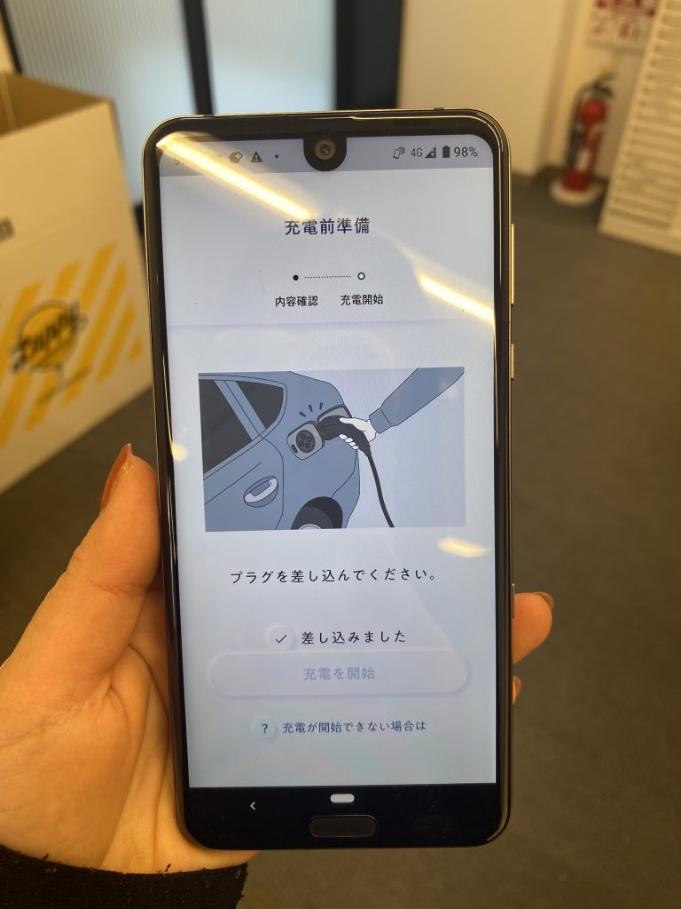 電気自動車の給電方法はとーっても簡単で、スマホのアプリを開いて指示通りにプラグを差し込むだけです!
