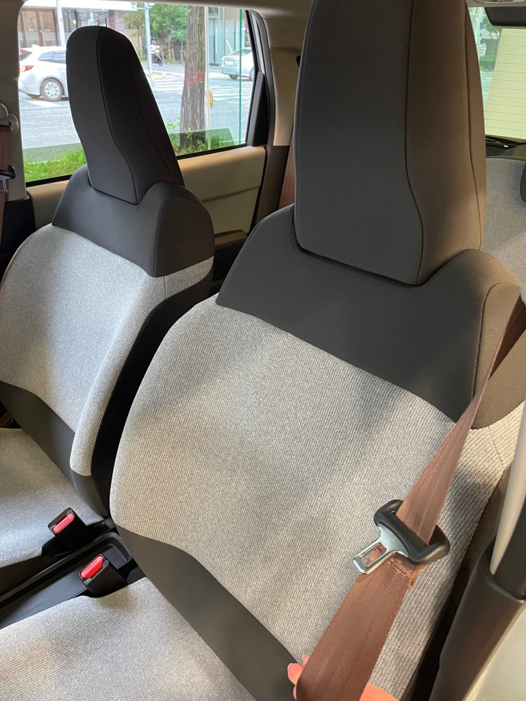 インテリアは明るいグレーカラーで、シートベルトの色がブラウンです💕オシャレ😆
