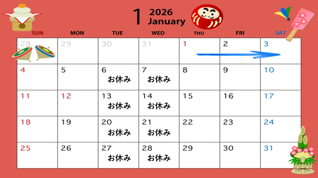 誠に勝手ではございますが、12月28日(日)~翌年1月3日(土)まで店休日とさせていただきます。