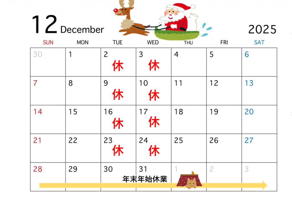 2025年12月28日(日)~1月3日(土)の期間、お休みとさせていただきます。