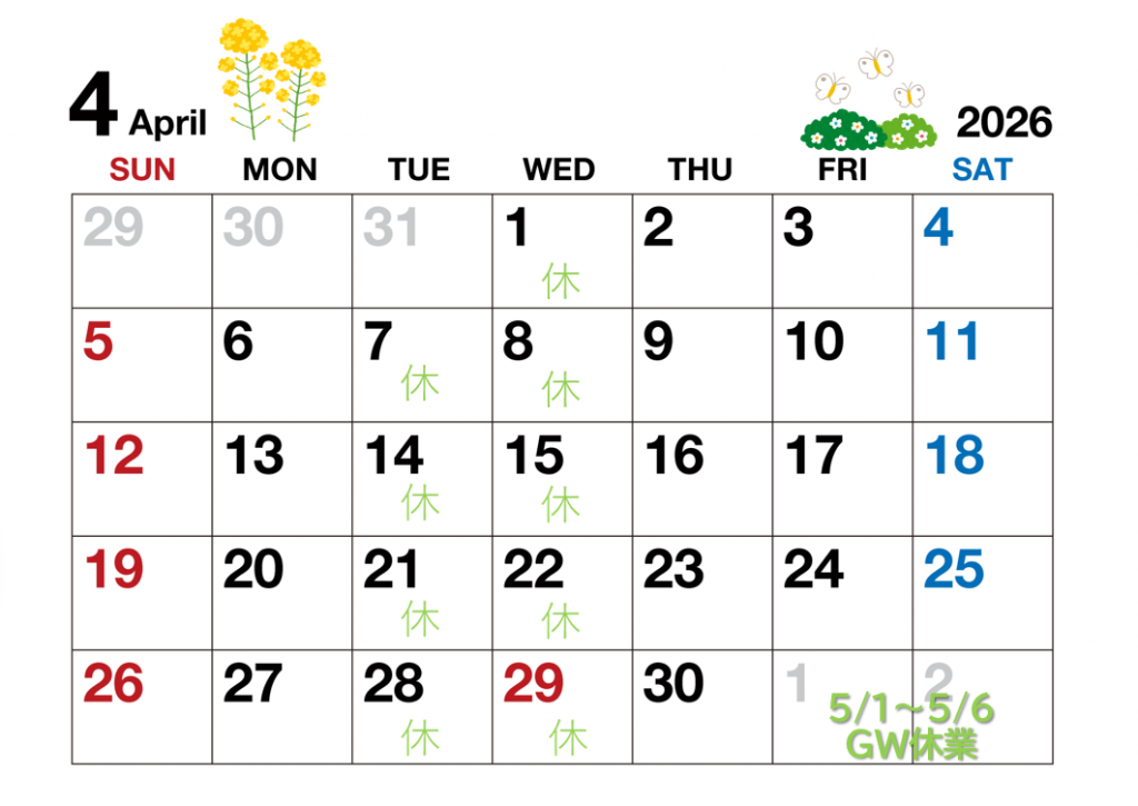 火曜、水曜にお休みとなりますが5月1日~6日の期間GW期間の為店休日となっております。