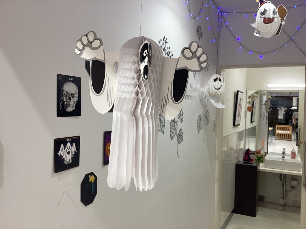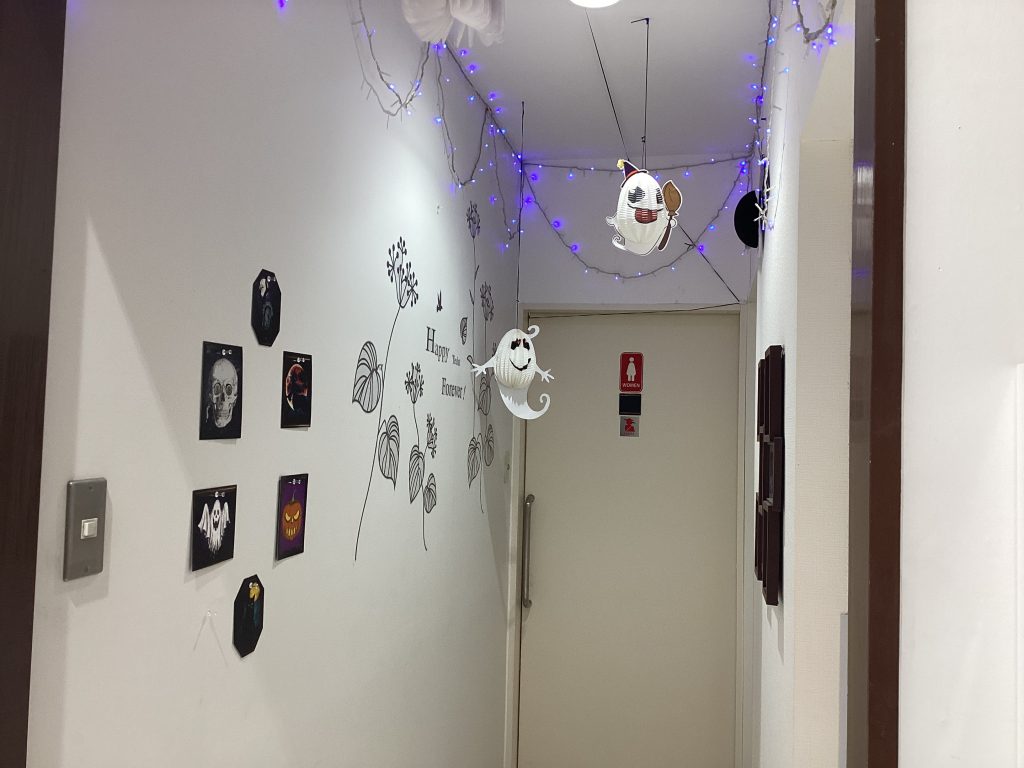 お手洗いに続く通路もハロウィンバージョンになりました🎃