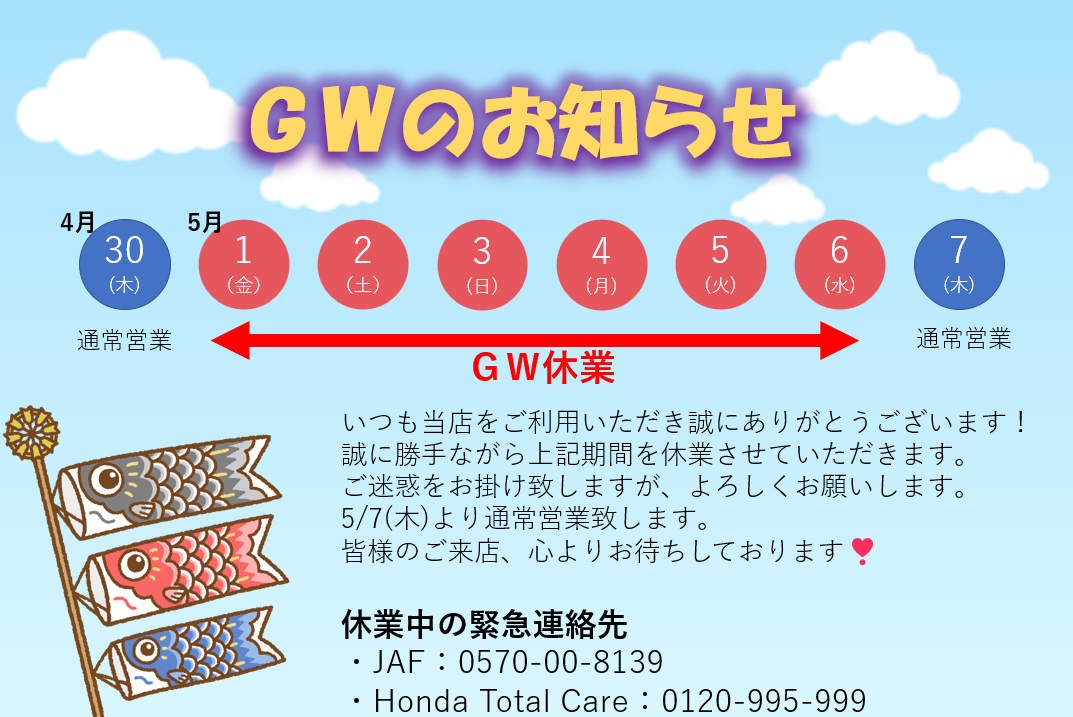 つづきましてGWの休店日のお知らせです。