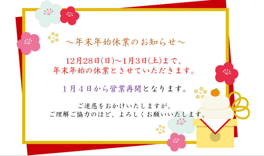 下記の通り、年末年始の休業日とさせていただきます。