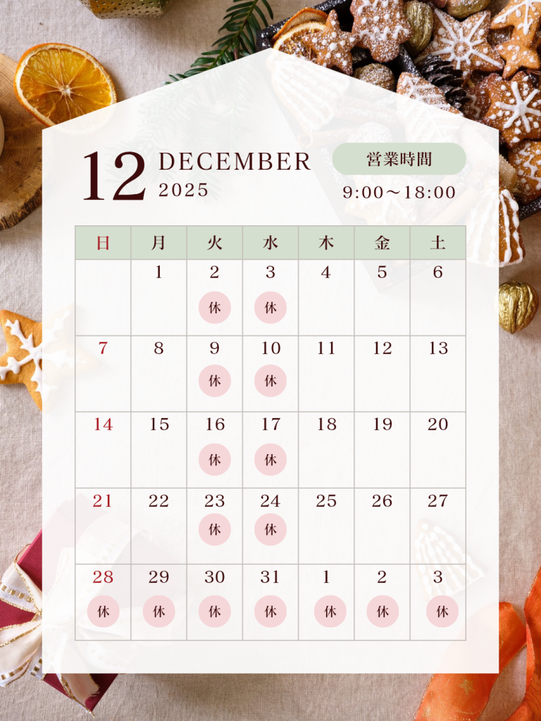 本日は、12月の店休日のご案内です。12月は、火曜•水曜日の定休日に加え、