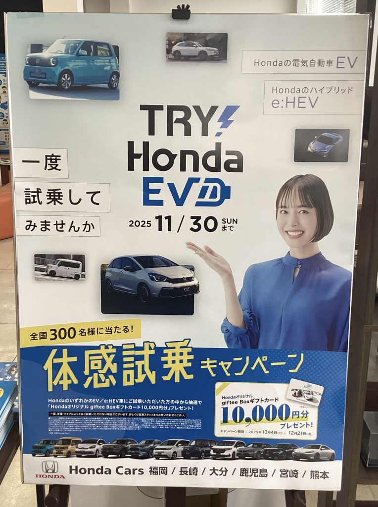 体感試乗キャンペーンと題してEV/e:HEV車にご試乗頂いた方から抽選でHondaオリジナルギフトカード10,000円分を全国300名様の中から当選するキャンペーンも実施しております🍀(キャンペーン期間:12/21まで)
