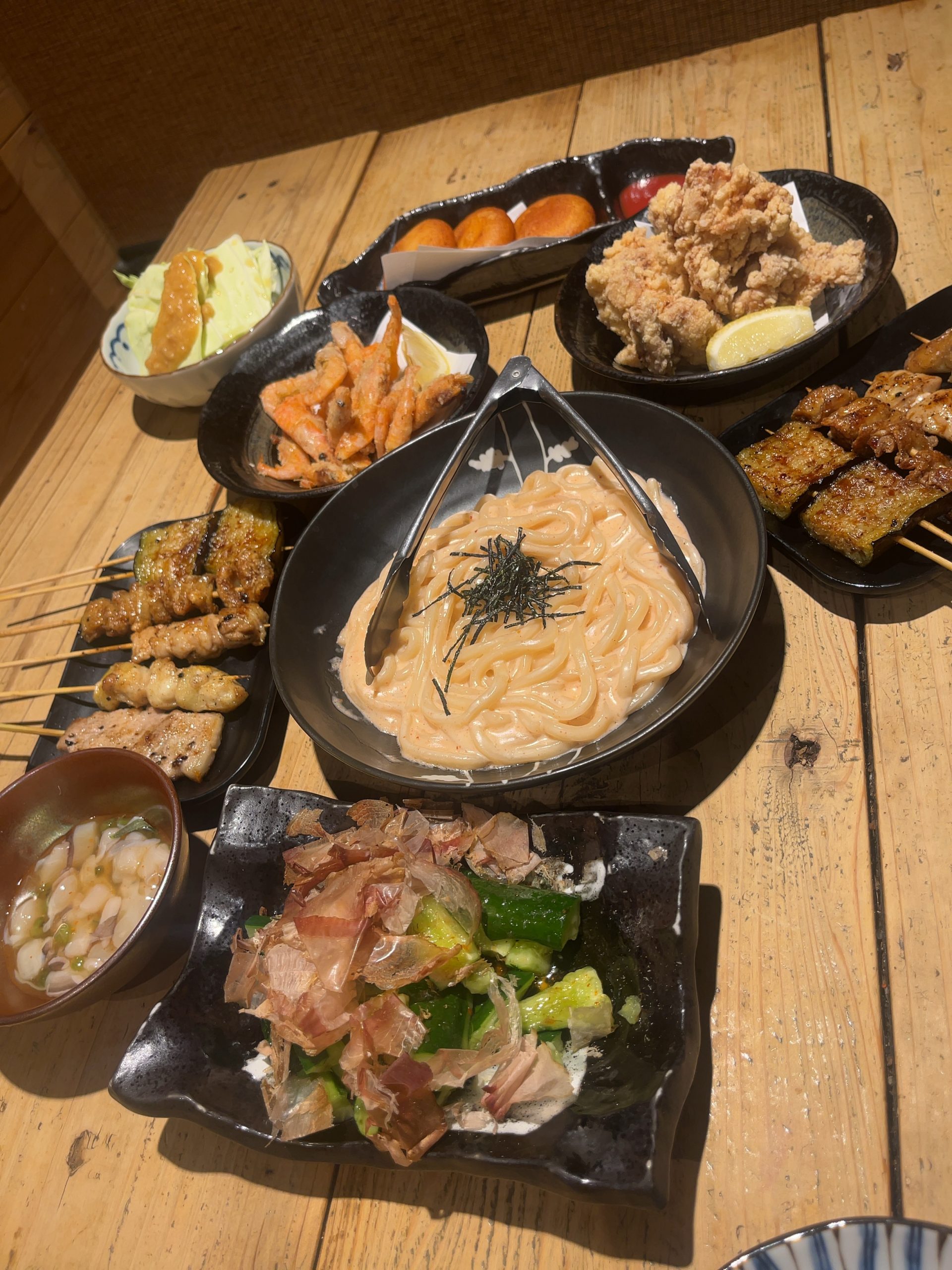 家族と一緒にトタン屋 健軍店に行ってきました‼️個人的に好きなメニューがありまして、明太子うどんとたたきキュウリ、焼鳥です。特に、明太子うどんは1度食べだしたら手が止まりません🤗