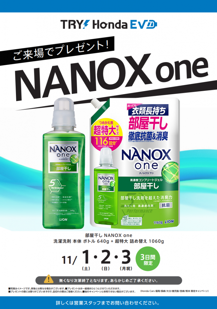 当店では11/1(土)~11/3(月・祝)の三日間限定でナノックスの洗濯洗剤と規格外品のナスを