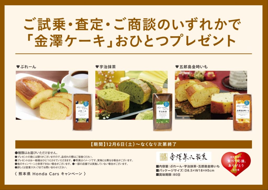 さらにご試乗・査定・ご商談のいずれかで「金澤ケーキ」をおひとつプレゼントいたします💓